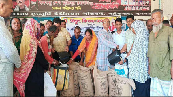 পবিত্র ঈদুল ফিতর উপলক্ষ্যে প্রধানমন্ত্রী শেখ হাসিনার উপহার হিসেবে পাইকগাছার দেলুটি ইউনিয়নে ভিজিএফ চাউল বিতরণ করা হয়েছে।বৃহস্পতিবার সকালে উপজেলা দেলুটি ইউনিয়নের বিভিন্ন ওয়ার্ডে সর্বমোট ১৪ শত ৪৯ টি পরিবারের মাঝে ১০ কেজি হারে ভিজিএফ চাউল বিতরণ করেন ইউপি চেয়ারম্যান রিপন কুমার মন্ডল। বিতরণ কালে সহকারী উপজেলা যুব উন্নয়ন কর্মকর্তা ও ট্যাগ অফিসার গোবিন্দ চন্দ্র দে, ইউপি সদস্য যথাক্রমে সুকুমার কবিরাজ, রাম চন্দ্র টিকাদার, বিনতা সরদার, রবীন্দ্র নাথ মন্ডল, কিংশুক রায়, চম্পক বিশ্বাস, পলাশ কান্তি রায়, রিংকু রায়, পবিত্র সরদার, বদিয়ার হোসেন, মেরী রানী সরদার,লক্ষ্মু রানী সরদার, ইউপি সচিব বিজয় কুমার পাল প্রমুখ উপস্থিত ছিলেন।