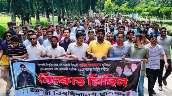 ইসলামী বিশ্ববিদ্যালয়ের (ইবি) শিক্ষার্থী সাজিদ আব্দুল্লাহ হত্যার প্রতিবাদে খুনীদের দ্রুত গ্রেফতার ও আওয়ামী দোসর শিক্ষকদের বিচারের দাবিতে বিক্ষোভ করেছে বাংলাদেশ জাতীয়তাবাদী ছাত্রদল, ইবি শাখা।বুধবার (২৭ আগস্ট) দুপুরে বিশ্ববিদ্যালয়ের অনুষদ ভবন